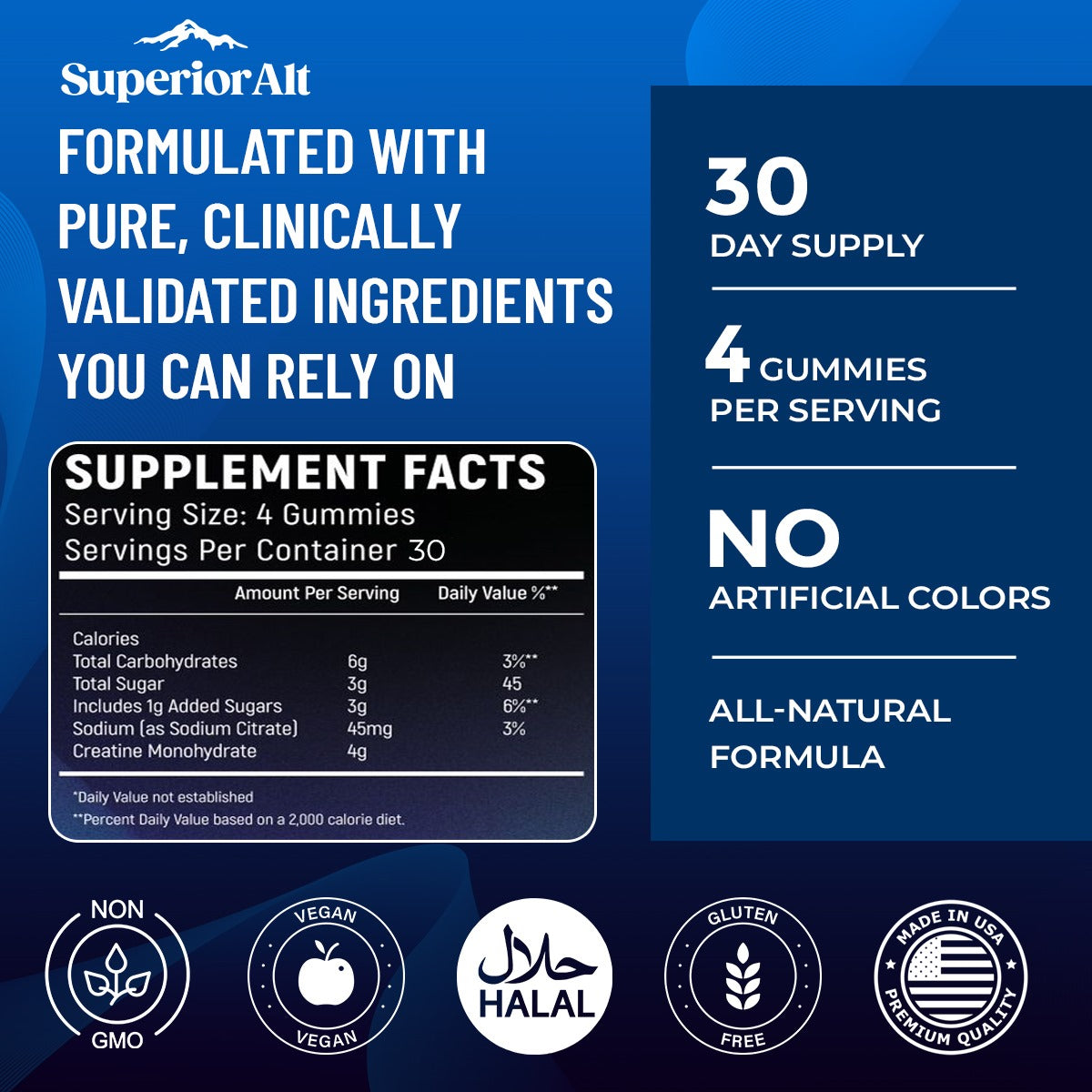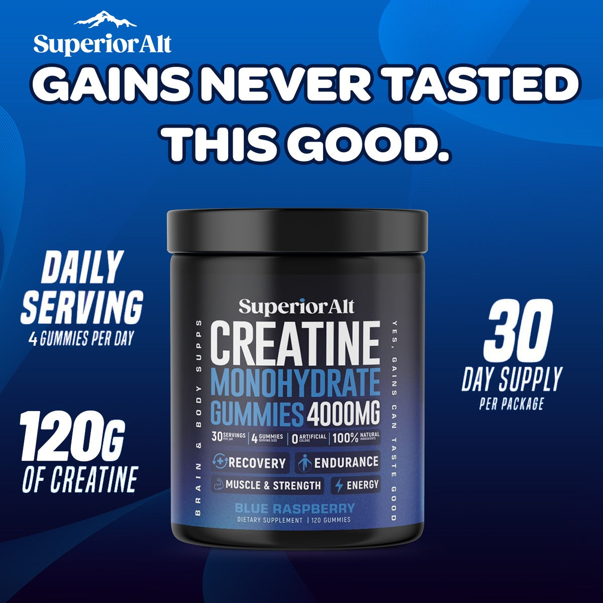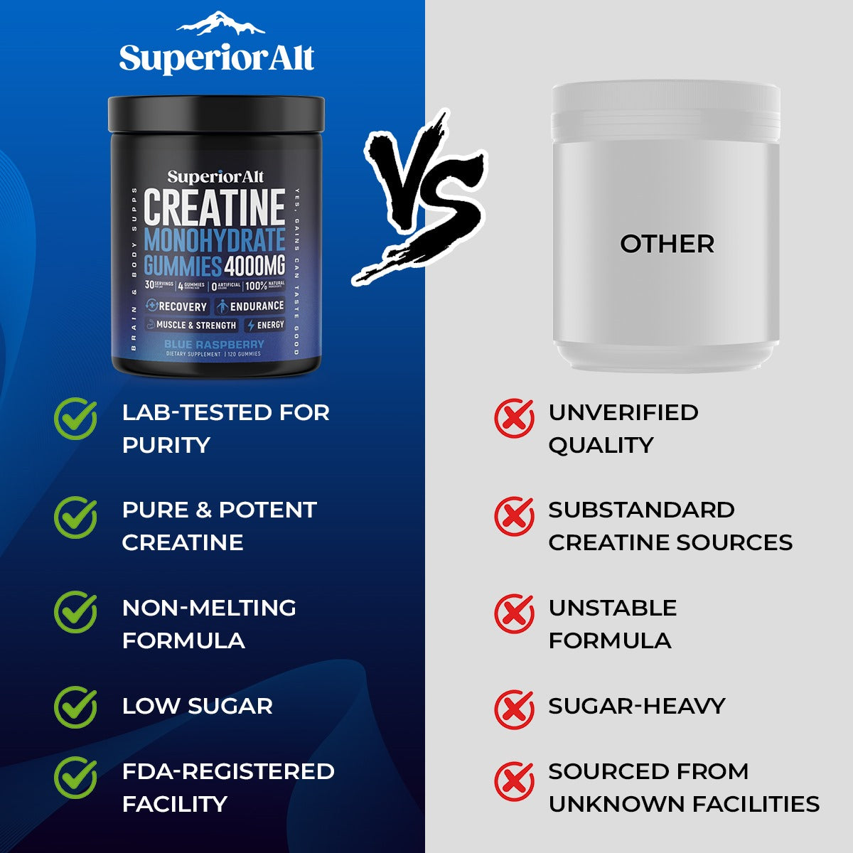 Superior Alt is crafted with the highest-quality, all-natural ingredients to deliver a clean and effective supplement for athletes and fitness enthusiasts. Every gummy provides a precise 1-gram dose of creatine, exactly as promised. With no artificial additives or fillers, just pure performance-enhancing creatine in a great-tasting, convenient form, you can trust our commitment to transparency, purity, and excellence.