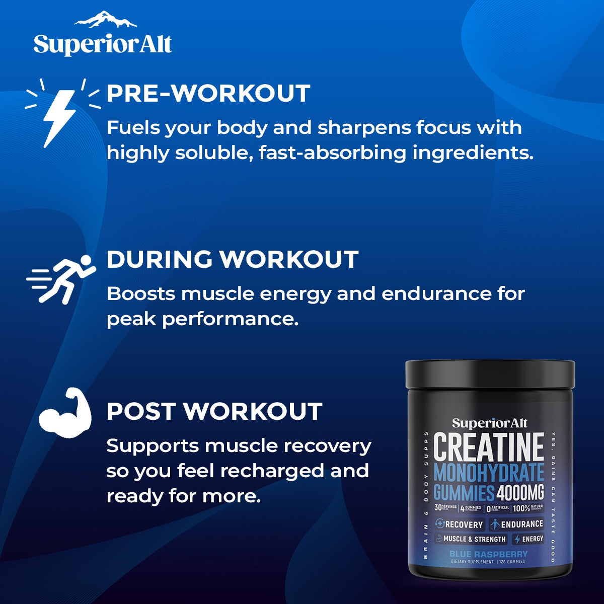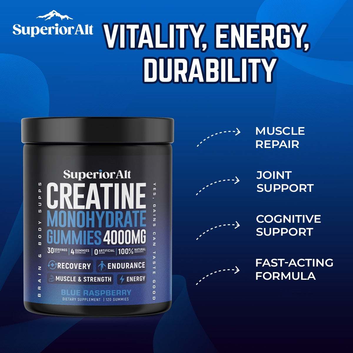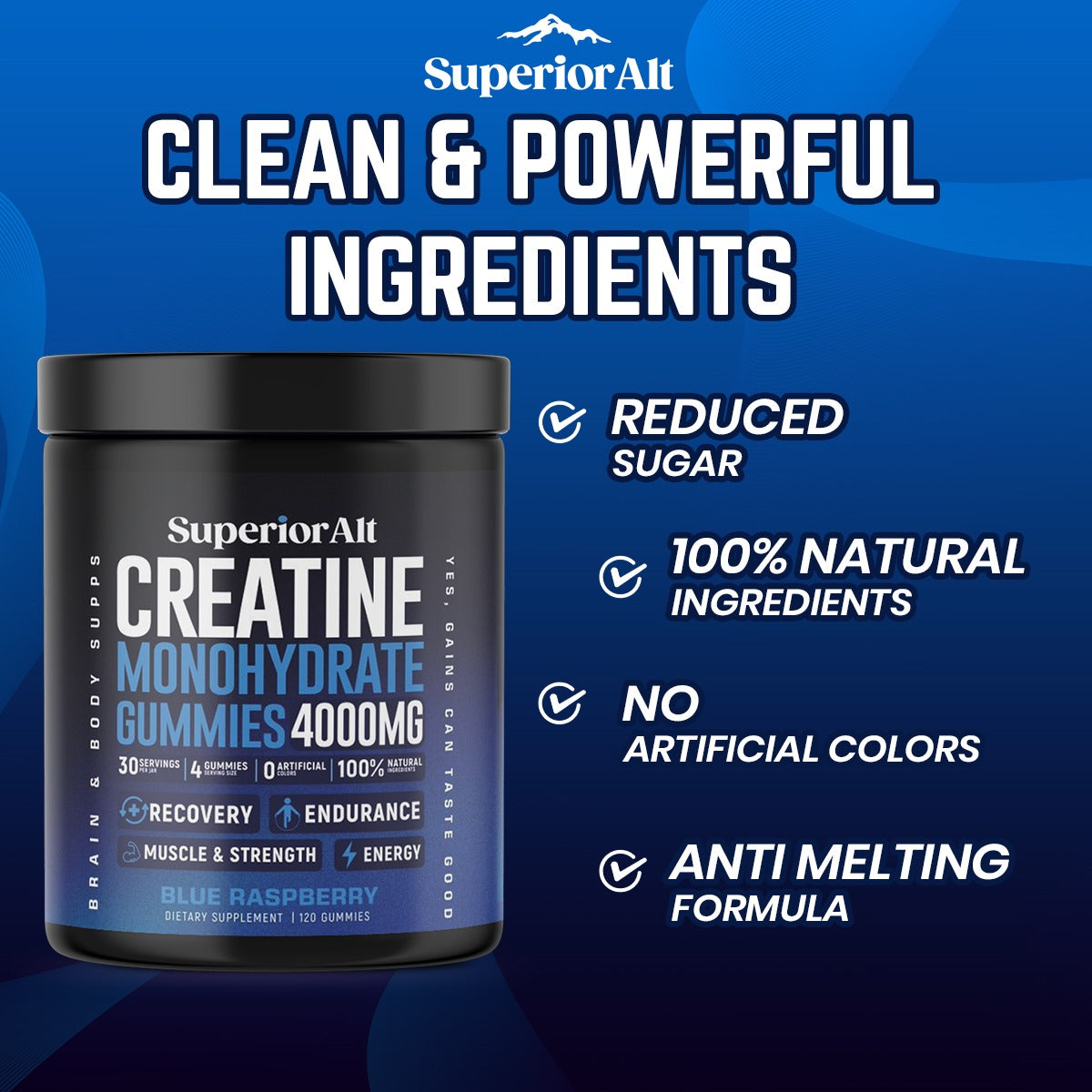 Superior Alt is crafted with the highest-quality, all-natural ingredients to deliver a clean and effective supplement for athletes and fitness enthusiasts. Every gummy provides a precise 1-gram dose of creatine, exactly as promised. With no artificial additives or fillers, just pure performance-enhancing creatine in a great-tasting, convenient form, you can trust our commitment to transparency, purity, and excellence.