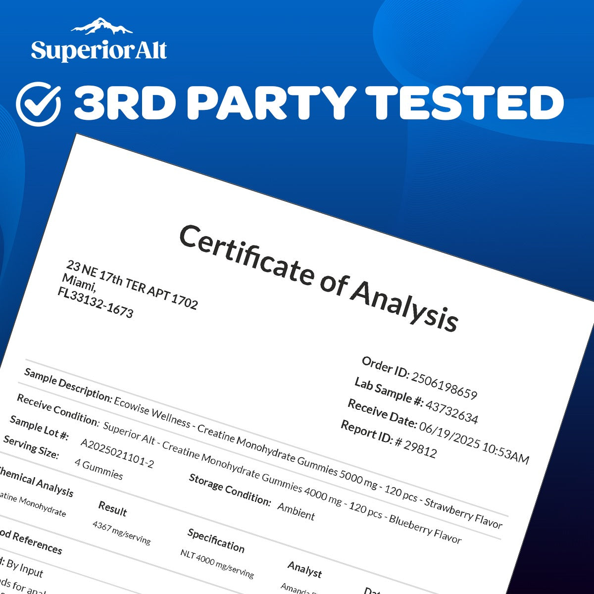 Superior Alt Creatine Gummies stand out from the competition because we are 3rd party tested to ensure the highest quality, safety, and effectiveness. Unlike many other creatine products on the market that skip this vital step, we prioritize transparency and quality control. This means you can trust that our gummies are free from contaminants and meet the strictest standards, so you get exactly what's on the label. At Superior Alt, your health and performance are our top priorities.